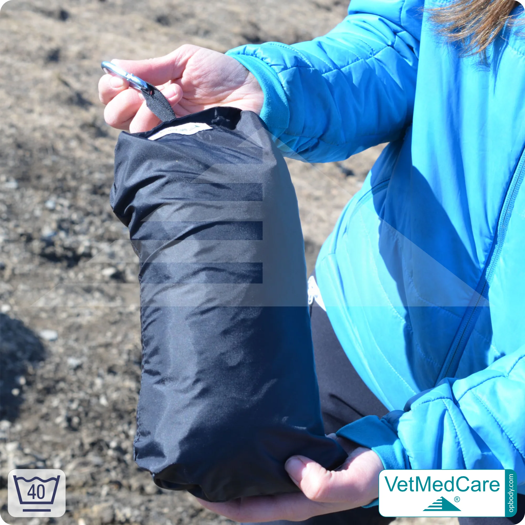 An der Hundedecken-Unterseite befindet sich eine integrierte, praktische Tasche mit Karabinerhaken. In diese integrierte Tasche kann die Decke eingepackt werden kann. Die federleichte Tasche kann dann am Rucksack oder an einem Gurt befestigt werden und kommt somit überall hin mit.