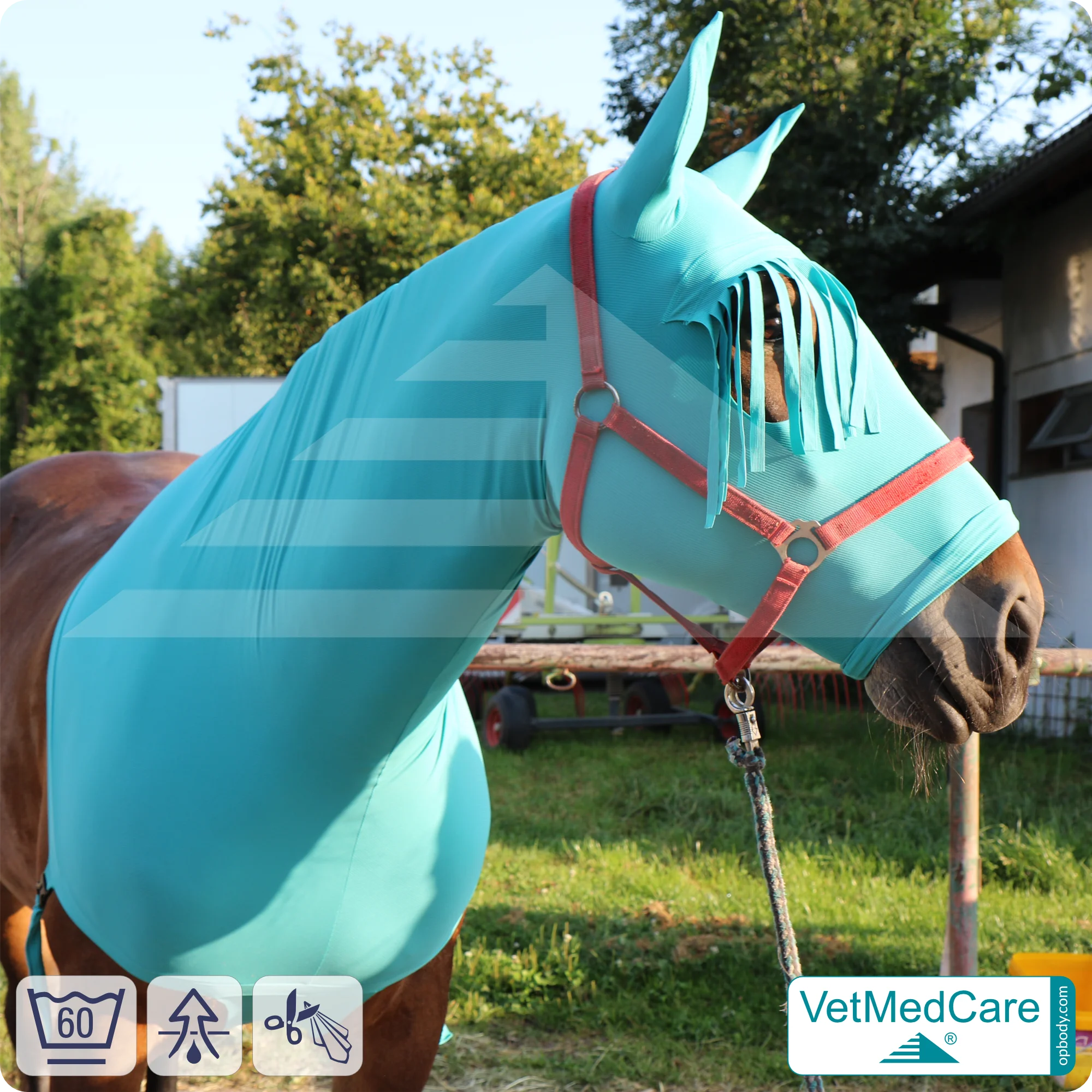 Sleazy oder Sleezy Pferde Body | Pferdehaube – Fliegenschutz, Mückenschutz bzw. Insektenschutz für den Kopf, die Ohren und den Hals – mit Stirnfransen | VetMedCare