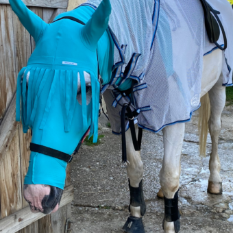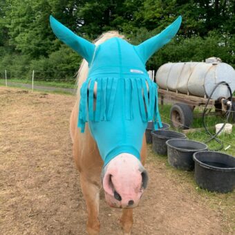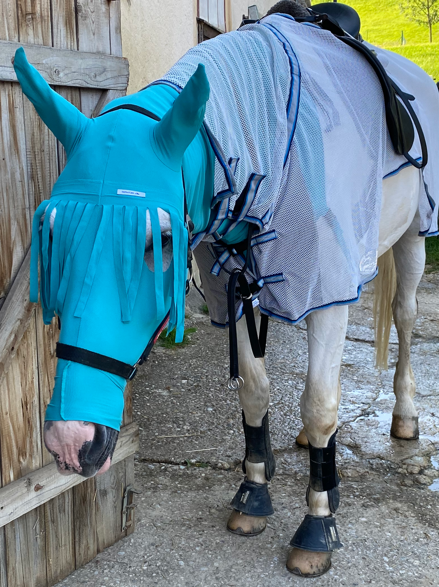Pferd Fliegenschutz | Insektenschutz | Kopfschutz & Ohrenschutz mit Stirnfransen | VetMedCare®. Feedbild.